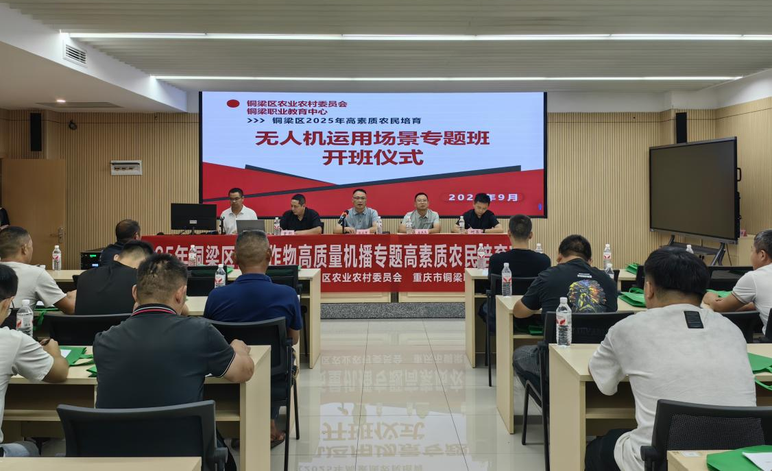 为加快培育懂技术、善经营、会管理的高素质农民队伍,切实提升无人机在农业生产场景中的应用效能与粮油作物机播质量,9月8日,由铜梁区农业农村委员会主办的2025年铜梁区无人机农业场景运用专题高素质农民培训班、铜梁区粮油作物高质量机播专题高素质农民培训班在我校正式开班。区农委副主任但永贵、区职教中心工会主席童驹等出席开班仪式。