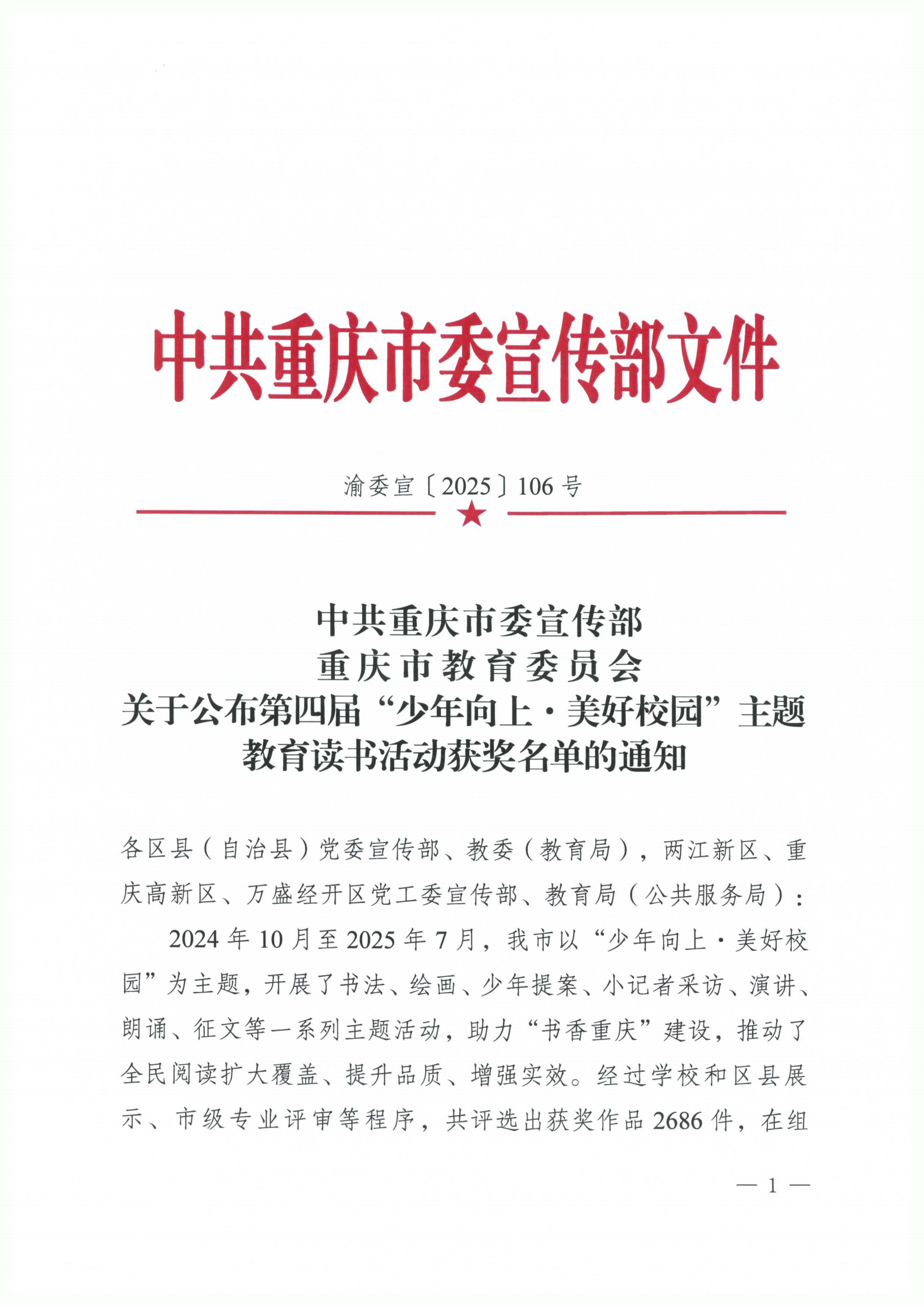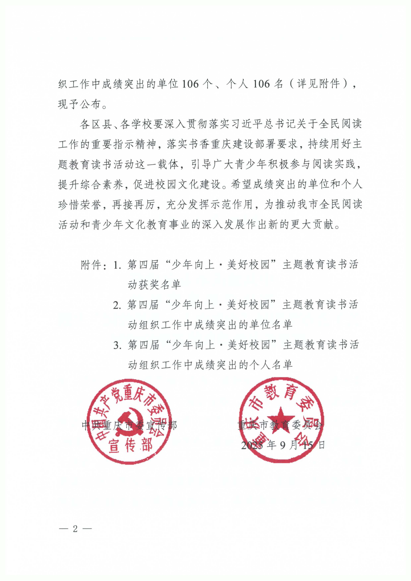 喜报丨我校在重庆市第四届“少年向上·美好校园”主题教育读书活动中荣获佳绩