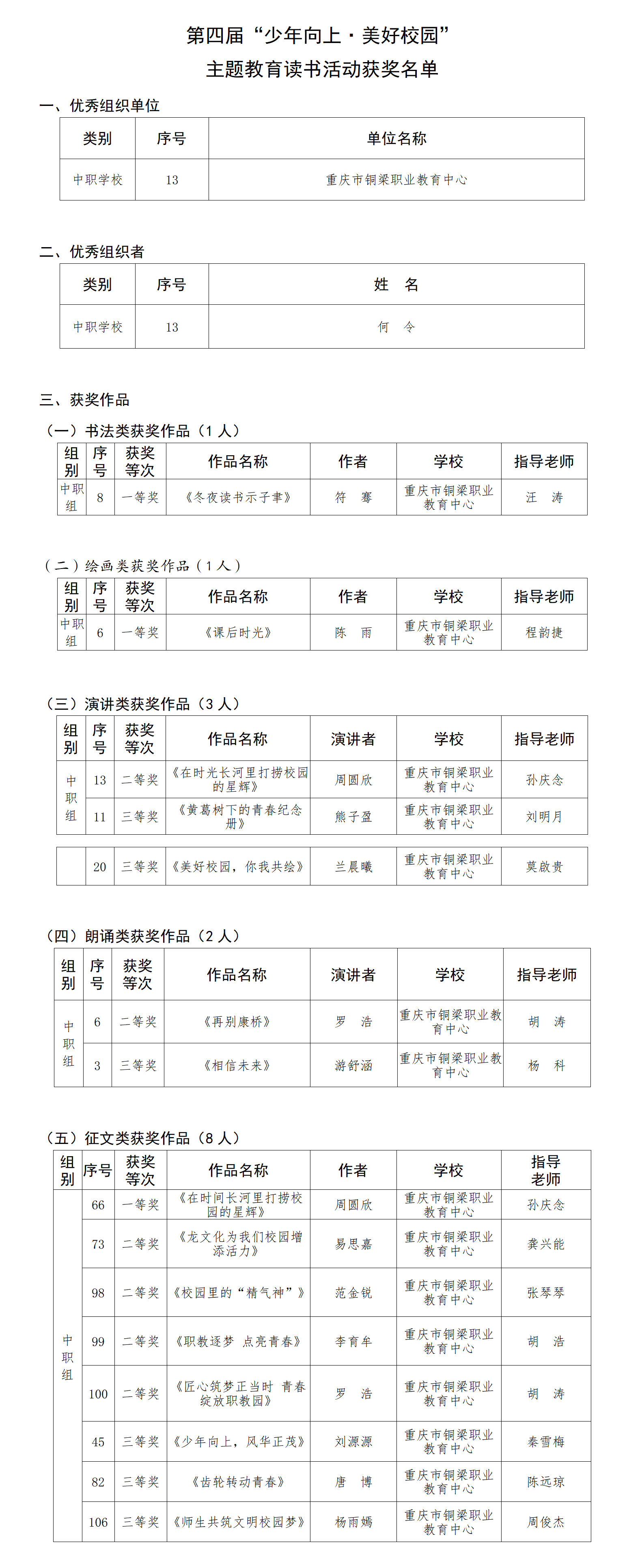 获奖作品覆盖书法、绘画、演讲、朗诵、征文等多个类别。成绩的取得,充分展现了铜梁职教师生积极向上的精神风貌与扎实的综合素养,为校园增添光彩!